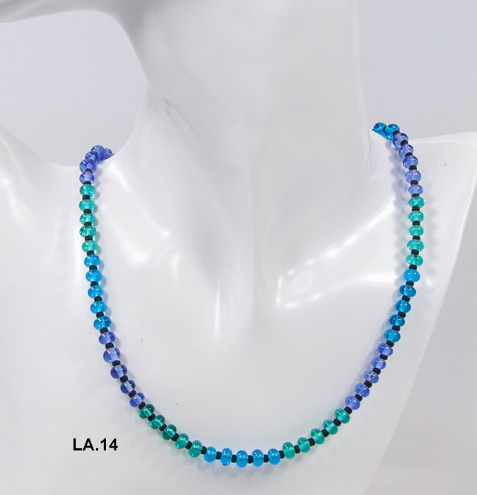 LA. 14 Collier Unikat = Aqua Farben, Blau-Türkis-Türkis Grün auf 0,5 mm Stahlband gezogene zahlreiche Handgearbeitete Glasperlen = Schwarze Glas Positionperlen Stück Preis auf Anfrage