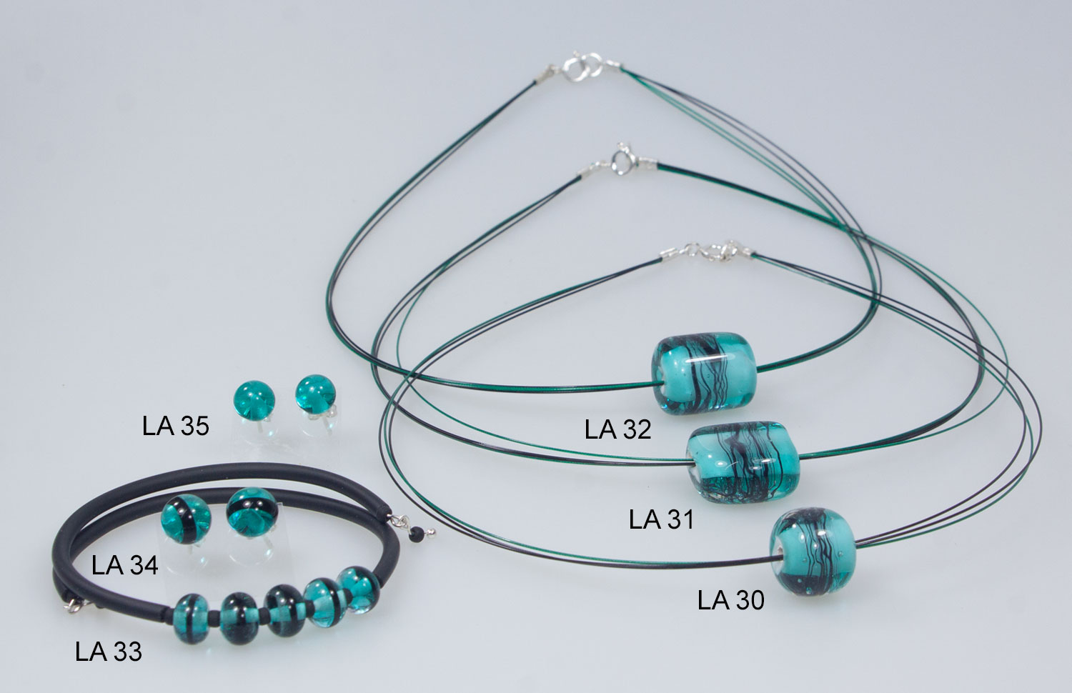 LA. 30 Collier Unikat = Kugel = Türkis / Grün = drei Edelstahlbänder mit farbigen Kautschukmantel und Handgearbeiteten Glasperlen Stück Preis auf Anfrage